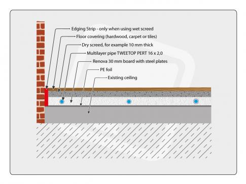 The load on the ceiling for Tweetop Renova system is 76kg/m2 (35mm thickness) for wet screed and only 35kg/m2 (25mm thickness) for dry screed usage.